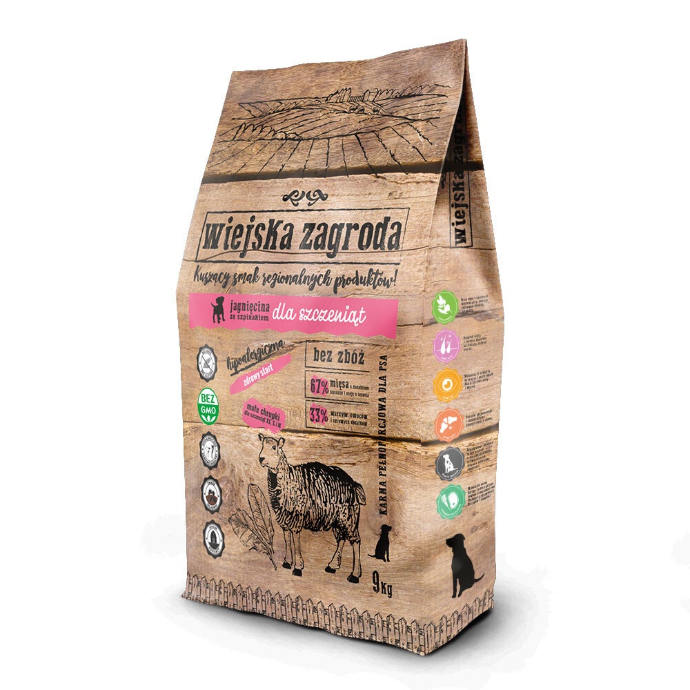 9kg. Wiejska Zagroda droog hondenvoer Lams met Spinazie voor Puppy's maat S