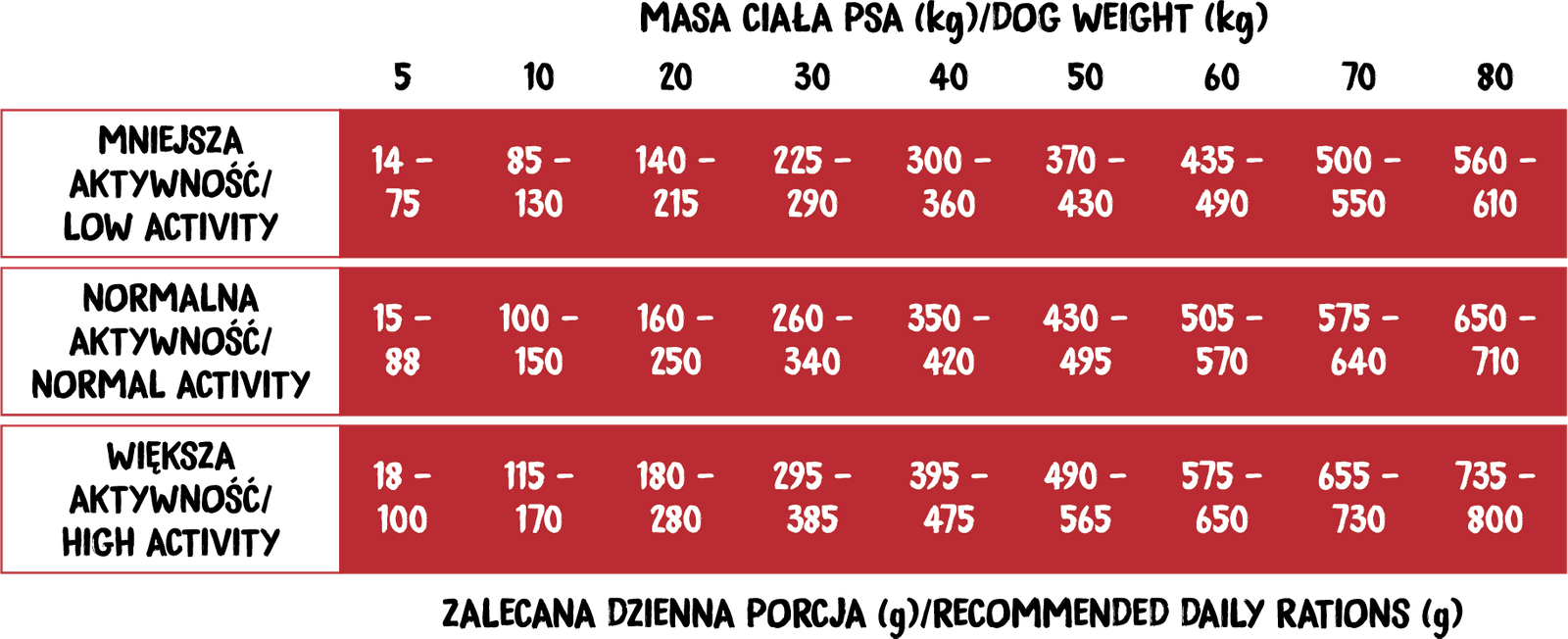 wołowina (53,5%, z czego dehydratyzowana wołowina 43,5 %, świeża wołowina 10 %), bataty, tłuszcz wieprzowy (12 %), ziemniaki, suszone wysłodki buraczane (z buraków cukrowych), drożdże (0,5 %), olej z łososia (0,5 %), składniki mineralne, wyciąg z cykorii (naturalne źródło FOS) (0,085 %), mannooligosacharydy (MOS) (0,05 %), glukozamina (0,05 %), siarczan chondroityny (0,045 %), MSM (0,04 %), wyciąg z Jukki Mojave (0,015 %), algi (Ascophyllum nodosum), suszone pomidory, natka pietruszki, wyciąg z żurawiny, kurkuma (0,01 %).