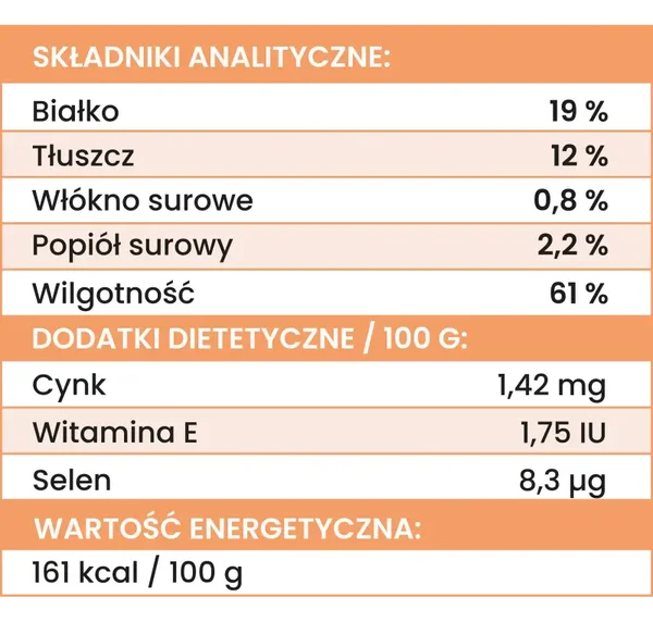 wieprzowina (93,5 %, w tym: 84,5 % mięso mięśniowe, 9 % wątroba wieprzowa), seler (4 %), nasiona chia (1 %), suszone drożdże piwne (0,6 %), wapń (0,3 %), algi morskie brunatne (0,24 %), olej z łososia (0,24 %), zioła (0,12 %, w tym: dzika róża, pokrzywa, jeżówka, kurkuma, ostropest plamisty), składniki mineralne