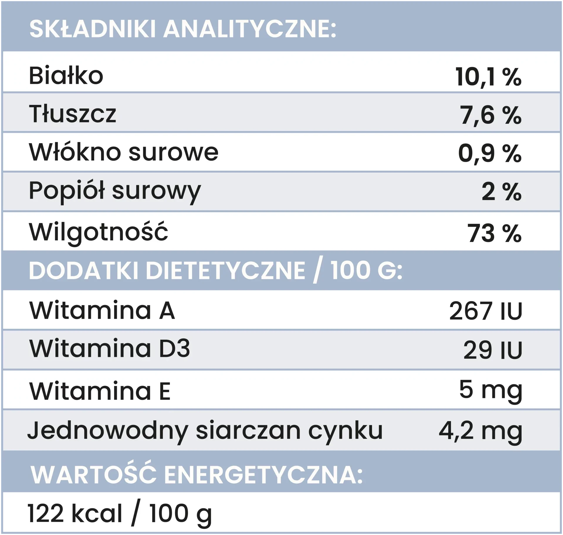 Jagnięcina 89 % (z czego 71 % mięso mięśniowe, 18 % podroby: serca, płuca, wątroba), dynia (8 %), nasiona chia (1 %), składniki mineralne (0,75 %), inulina (0,65 %), algi morskie brunatne (0,24 %), olej z łososia (0,24 %), zioła (0,12 %, w tym: dzika róża, pokrzywa, jeżówka, kurkuma, ostropest plamisty).