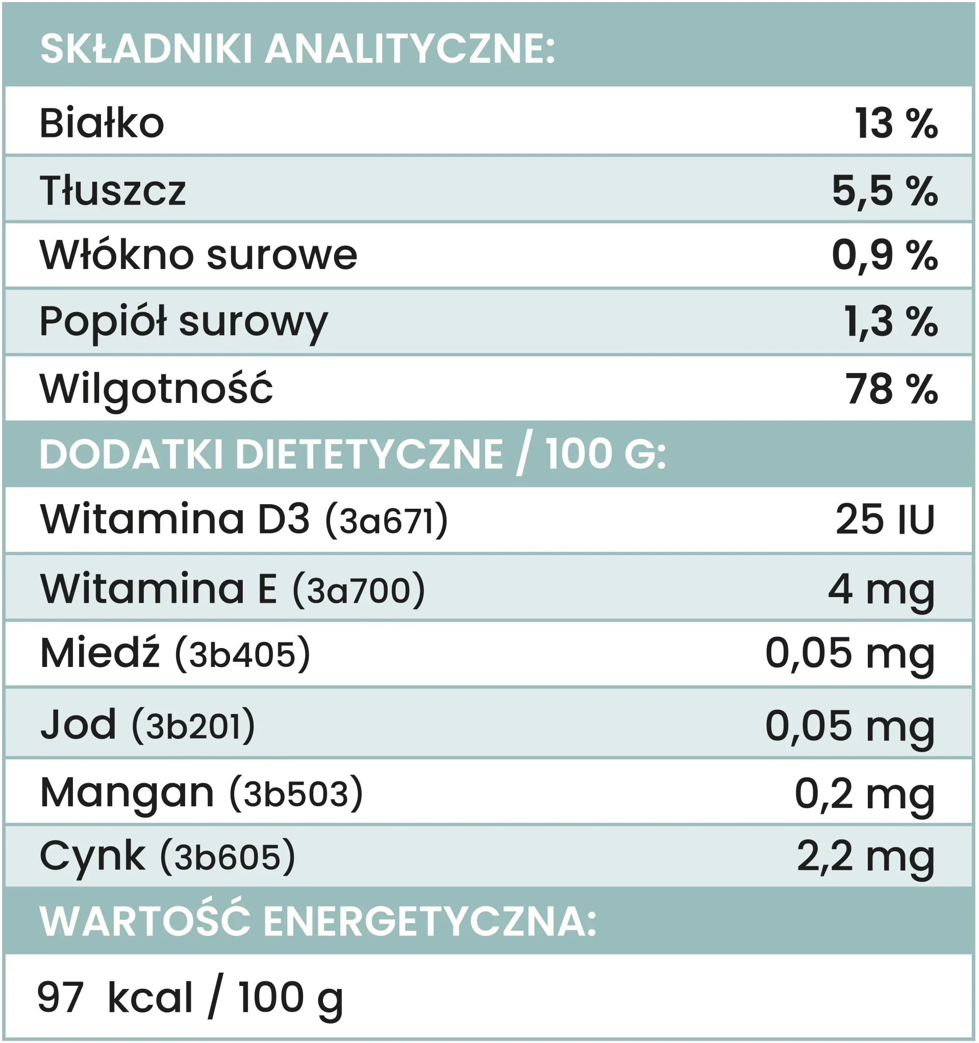 konina (88,75%, w tym: 74,25 % mięso mięśniowe, 14,5 % podroby: płuca, żołądek, tchawica, serca), dynia (8 %), nasiona chia (1 %), składniki mineralne (1 %), inulina (0, 65 %), algi morskie brunatne (0,24 %), olej z łososia (0,24 %), zioła (0,12 %, w tym: dzika róża, pokrzywa, jeżówka, kurkuma, ostropest plamisty).