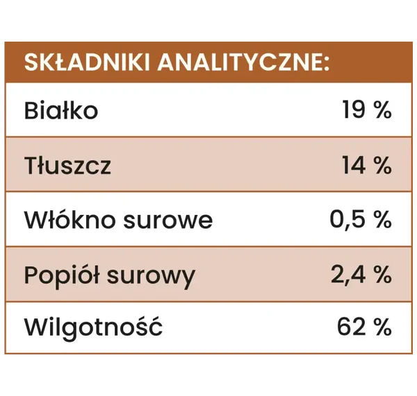 wieprzowina (96,1 %, w tym: 77,1 % mięso mięśniowe, 19 % wątroba wieprzowa), marchew (1 %), nasiona chia (1 %), suszone drożdże piwne (0,6 %), wapń (0,4 %), algi morskie brunatne (0,29 %), olej z łososia (0,25 %), olej lniany (0,12 %), olej arachidowy (0,12 %), zioła (0,12%, w tym: dzika róża, pokrzywa, jeżówka, kurkuma, ostropest plamisty), składniki mineralne
