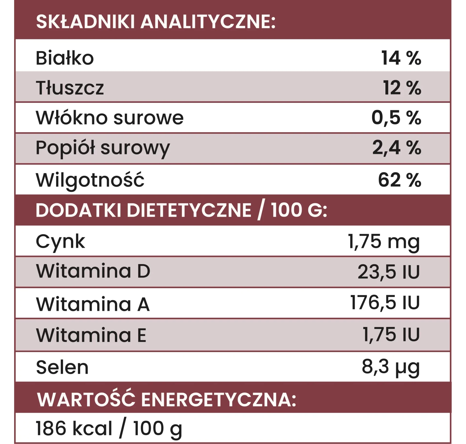 indyk (93,5 %, w tym: 75,5 % mięso mięśniowe, 18 % serca indycze), cukinia (4 %), nasiona chia (1 %), suszone drożdże piwne (0,6 %), wapń (0,3 %), algi morskie brunatne (0,24 %), olej z łososia (0,24 %), zioła (0,12 %, w tym: dzika róża, pokrzywa, jeżówka, kurkuma, ostropest plamisty), żurawina (0,12 %), składniki mineralne