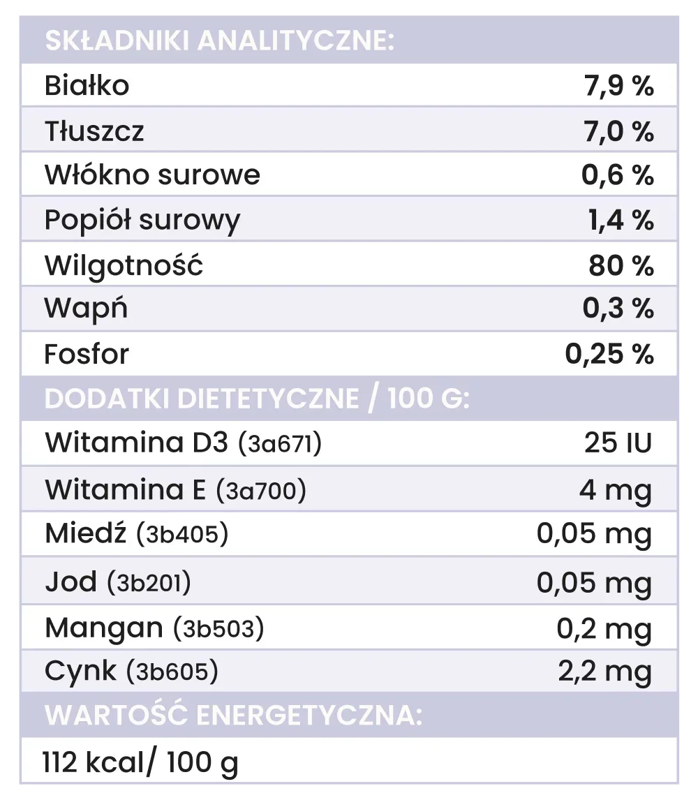 bażant (88,75 %, w tym: 74,25 % mięso mięśniowe, 14,5 % podroby: żołądki, serca, wątroba), gruszka (4 %), dynia (4 %), nasiona chia (1 %), witaminy i minerały (1 %), inulina (0, 65 %), algi morskie brunatne (0,24 %), olej z łososia (0,24 %), zioła (0,12 %, w tym: dzika róża, pokrzywa, jeżówka, kurkuma, ostropest plamisty).