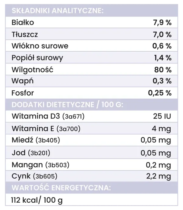 Wapń: 0,3% ; fosfor: 0,25%