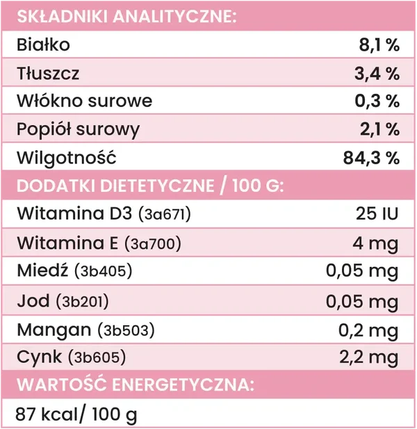 królik (88,75 %, w tym: 74,25 % mięso mięśniowe, 14,5 % podroby: serca, żołądki, wątroba), marchew (8 %), nasiona chia (1 %), składniki mineralne (1 %), inulina (0, 65 %), algi morskie brunatne (0,24 %), olej z łososia (0,24 %), zioła (0,12 %, w tym: dzika róża, pokrzywa, jeżówka, kurkuma, ostropest plamisty).