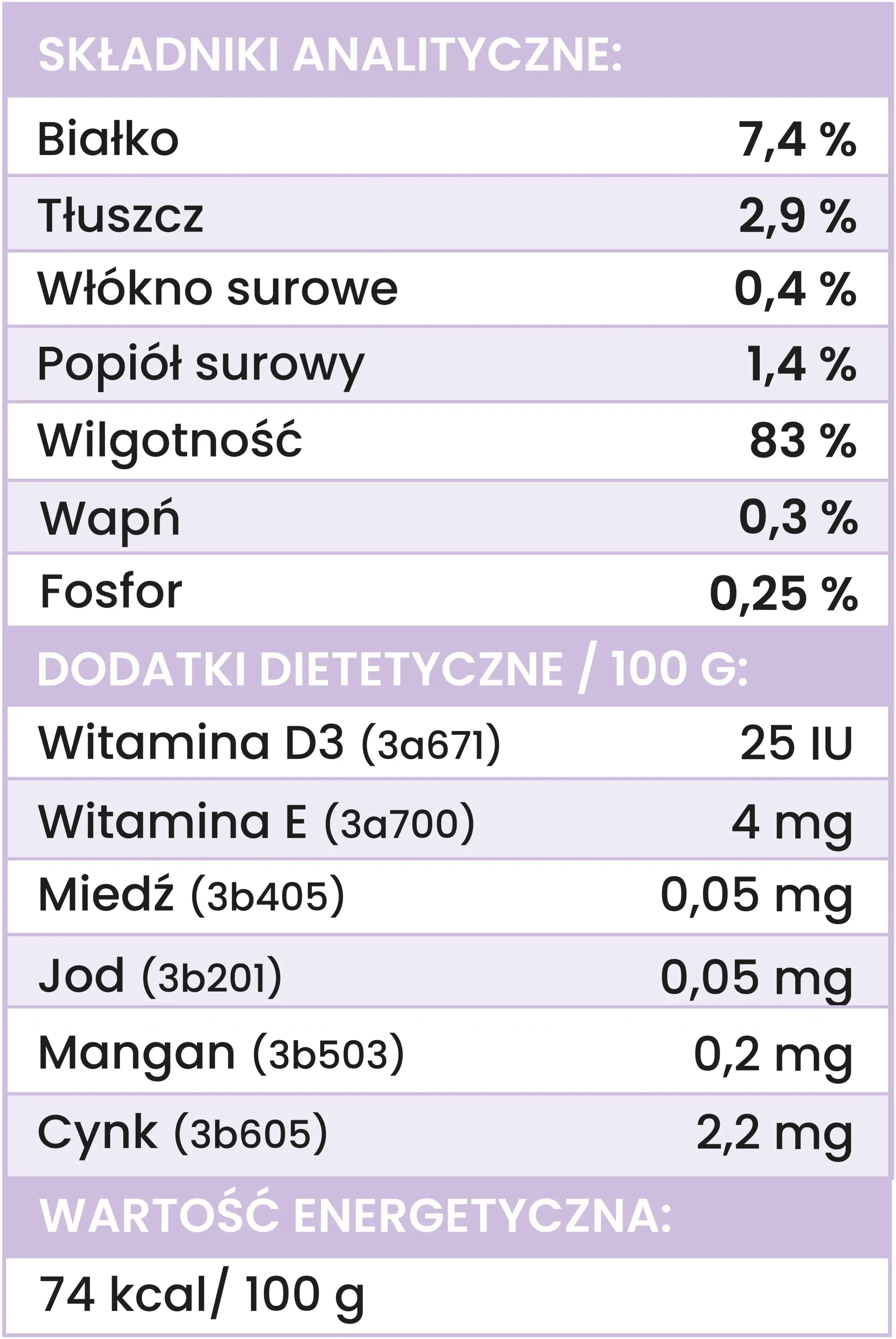 Wapń: 0,3% ; fosfor: 0,25%