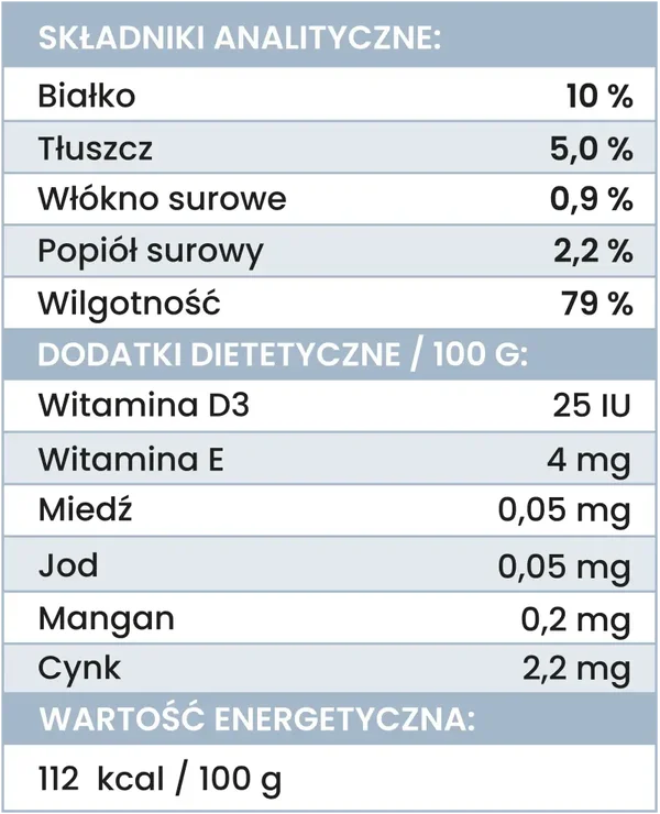 koza (88,75%, w tym: 74,25 % mięso mięśniowe, 14,5 % podroby: płuca, żołądek, wątroba), bataty (8 %), nasiona chia (1 %), składniki mineralne (1 %), inulina (0, 65 %), algi morskie brunatne (0,24 %), olej z łososia (0,24 %), zioła (0,12 %, w tym: dzika róża, pokrzywa, jeżówka, kurkuma, ostropest plamisty).