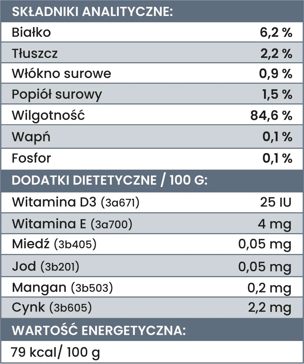 kaczka (63,75 %, w tym: 51 % mięso mięśniowe, 12,75 % podroby), cukinia (10 %), dynia (10 %), marchew (6%), jabłko (4 %), borówka (1%), malina (1%), siemie lniane (1 %), witaminy i minerały (1 %), MCT (1 %), inulina (0, 65 %), zioła (0,4 %, w tym: kurkuma, pokrzywa, mięta, rumianek, ostropest plamisty), MSM (0,2 %).