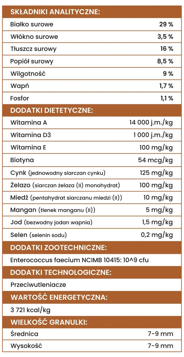 Indyk (51 %, w tym 36 % indyk suszony, 15 % indyk świeży), słodkie ziemniaki (bataty, 8 %), tłuszcz zwierzęcy (wołowy, 5 %), jabłko suszone, wątroba z wieprzowiny hydrolizowana (4 %), płatki ziemniaczane, gruszka suszona, marchew suszona, siemię lniane (2 %), wysłodki buraczane suszone (z buraków cukrowych), drożdże piwne suszone, olej z łososia (1 %), składniki mineralne, cykoria suszona (0,5 %), brokuły suszone, produkty jajeczne suszone (0,5 %), MOS (manno-oligosacharydy), żurawina suszona (0,3 %), pomidory suszone, chlorowodorek glukozaminy (600 mg/kg), siarczan chondroityny (600 mg/kg), borówki suszone, ekstrakty roślinne (Jukka Mojave (0,05 %), Rosmarinus sp., Curcuma sp., Citrus sp.).