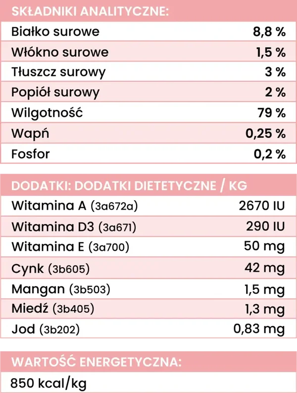 Mięso mięśniowe, warzywa, drogocenne podroby w odpowiedniej proporcji oraz zioła i suplementy wspierające metabolizm i witalność, to skrupulatnie opracowane formuły karm mokrych dla najbardziej wymagających podniebień i najdelikatniejszych przewodów pokarmowych.