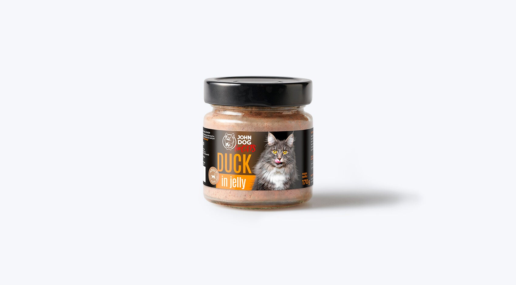 Eend in gelei is een complete natte voeding voor volwassen katten met een uitzonderlijk hoog vleesgehalte – maar liefst 95% eend in de vorm van sappige stukjes in gelei. Het is een graanvrije, monoproteïne en hypoallergene natte voeding met een zeer laag koolhydraatgehalte, verrijkt met zalmolie, taurine en calcium. Door de hoge smakelijkheid en de aromatische geur en smaak is het zeer geschikt voor kieskeurige katten. Product ontwikkeld in samenwerking met een diëtist.