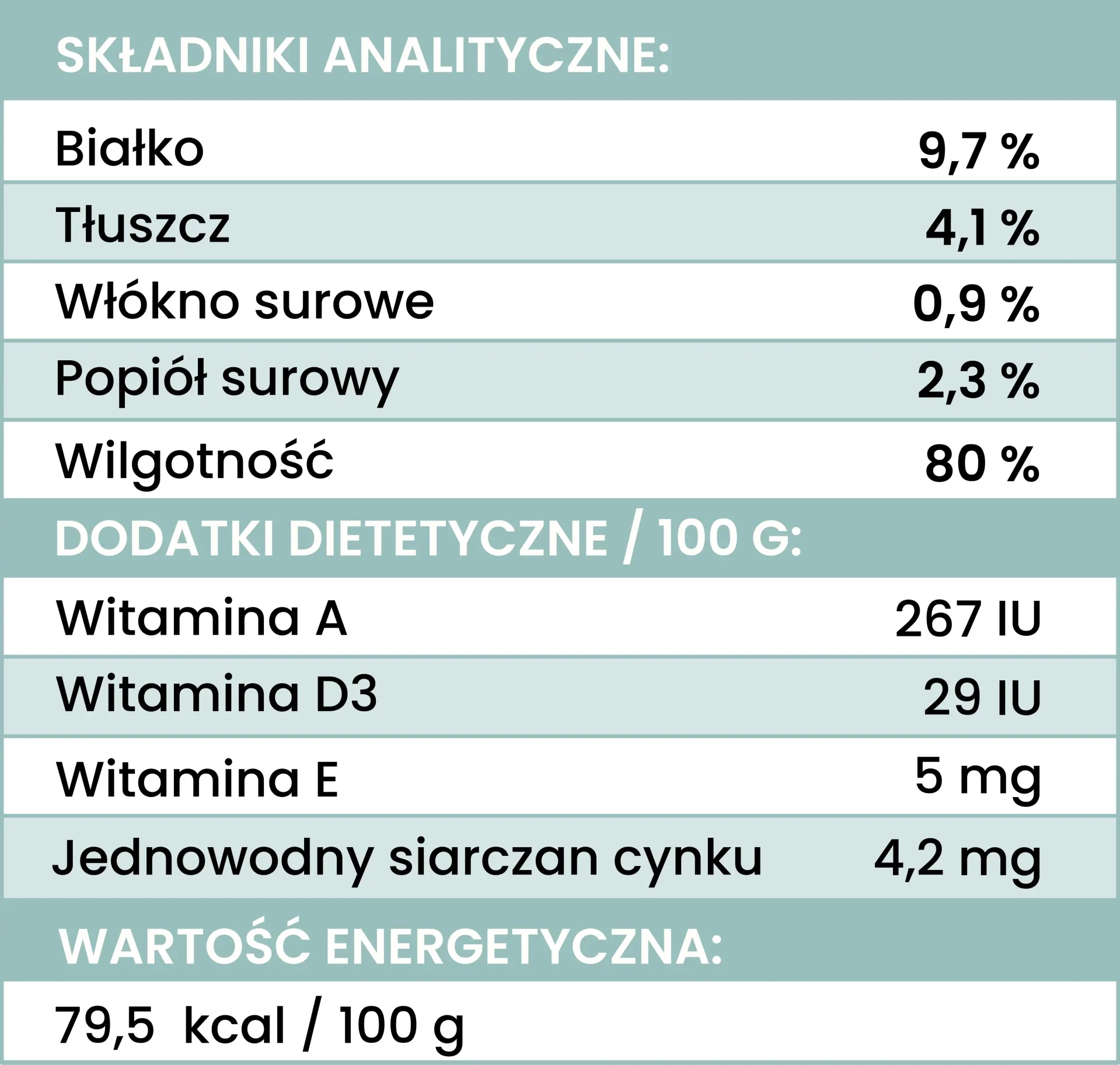Skład: dorsz 89 % (z czego 89% filet z dorsza), marchew (8 %), nasiona chia (1 %), witaminy i minerały (0,75 %), inulina (0, 65 %), algi morskie brunatne (0,24 %), olej z łososia (0,24 %), zioła (0,12 %, w tym: dzika róża, pokrzywa, jeżówka, kurkuma, ostropest plamisty).