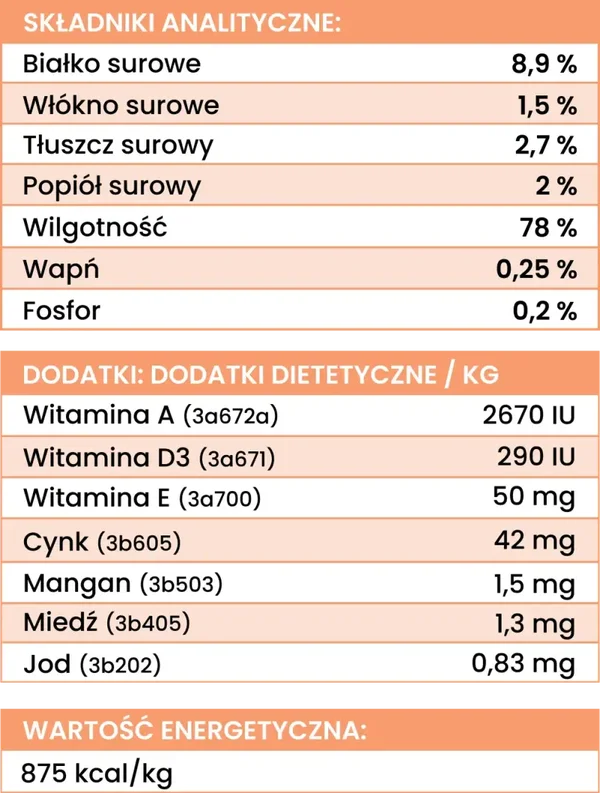 Mięso mięśniowe, warzywa, drogocenne podroby w odpowiedniej proporcji oraz zioła i suplementy wspierające metabolizm i witalność, to skrupulatnie opracowane formuły karm mokrych dla najbardziej wymagających podniebień i najdelikatniejszych przewodów pokarmowych.