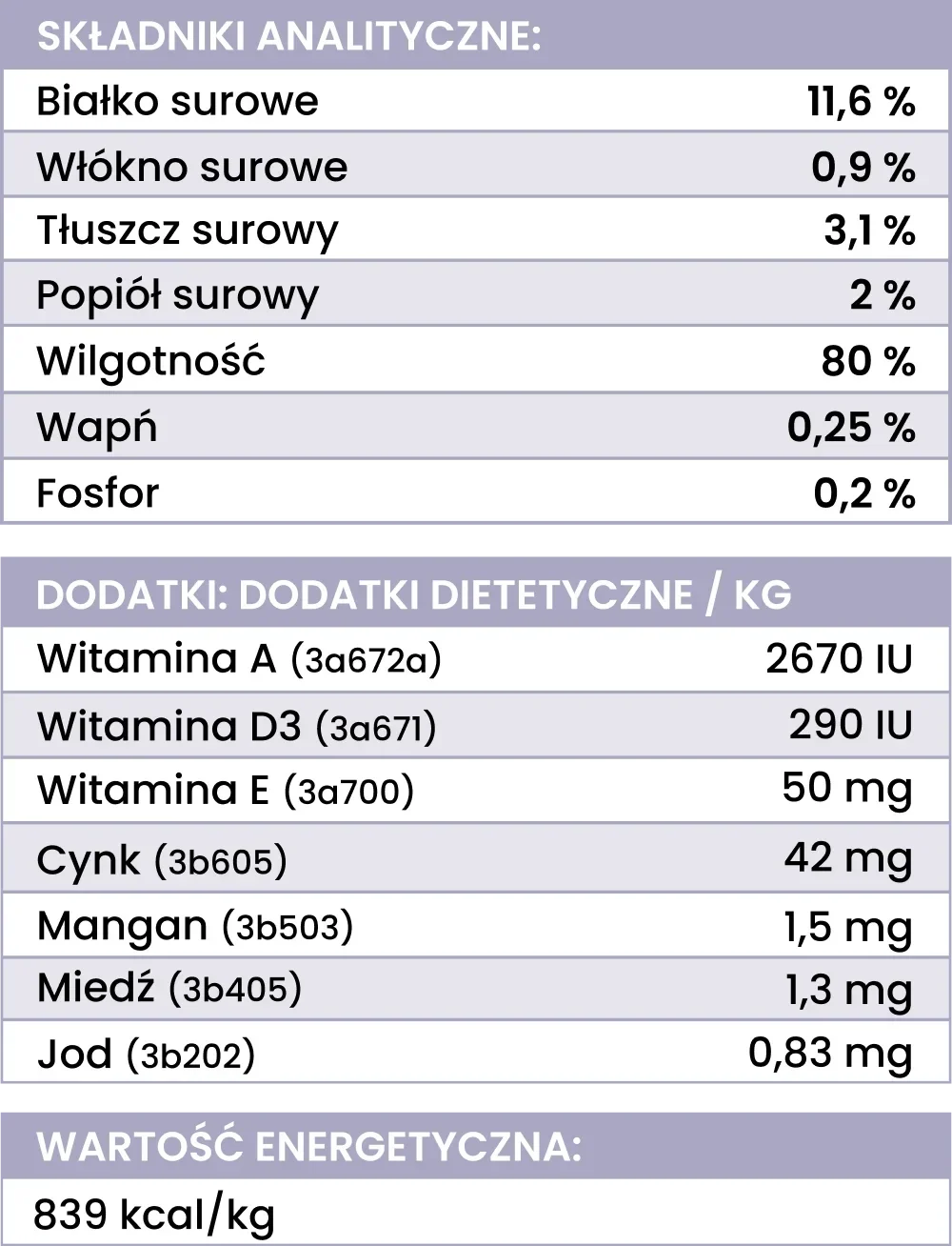 Skład: morszczuk 89 % (z czego 89% filet z morszczuka), batat (6 %), borówka (2 %), nasiona chia (1 %), witaminy i minerały (0,75 %), inulina (0, 65 %), algi morskie brunatne (0,24 %), olej z łososia (0,24 %), zioła (0,12 %, w tym: dzika róża, pokrzywa, jeżówka, kurkuma, ostropest plamisty).